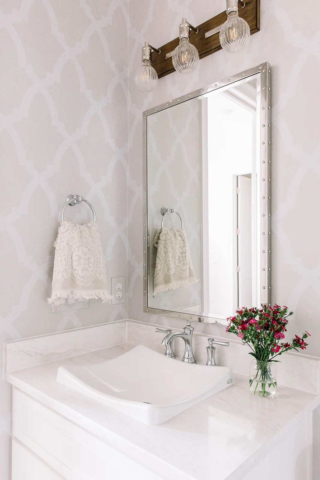 Do you have one of those plate glass mirrors with the metal clips? Then take it down and install a framed mirror. Pretty mirrors can be found most anywhere. Check out Lowe’s, Home Goods or Target for the most options at the best prices. My biggest piece advice is go as big as you can! You are only limited by the width of your cabinet and location of the light fixture.