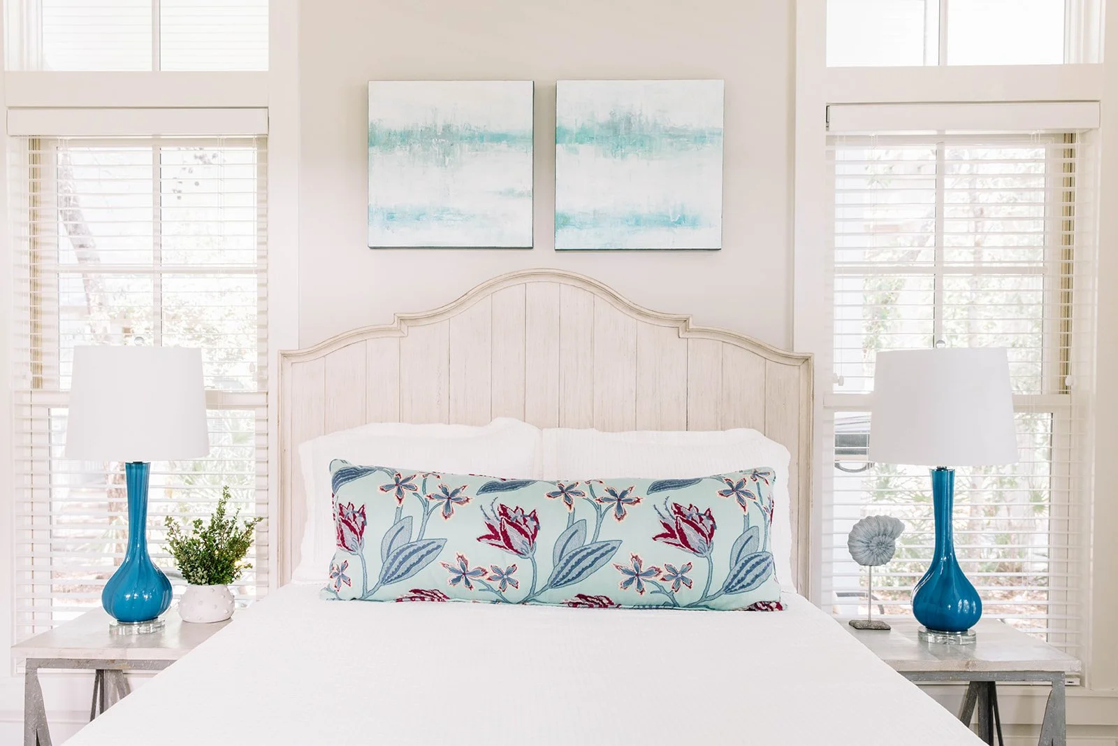 In the bedroom, I’m a big fan of keeping most of your bedding neutral and adding the personality with pillows, art and lamps. For this beach house bedroom, we used easy-to-clean quilts and shams with a large lumbar pillow in the prettiest floral fabric. Instead of custom, try finding two rectangle pillows or three small squares you can place together to re-create this same look.