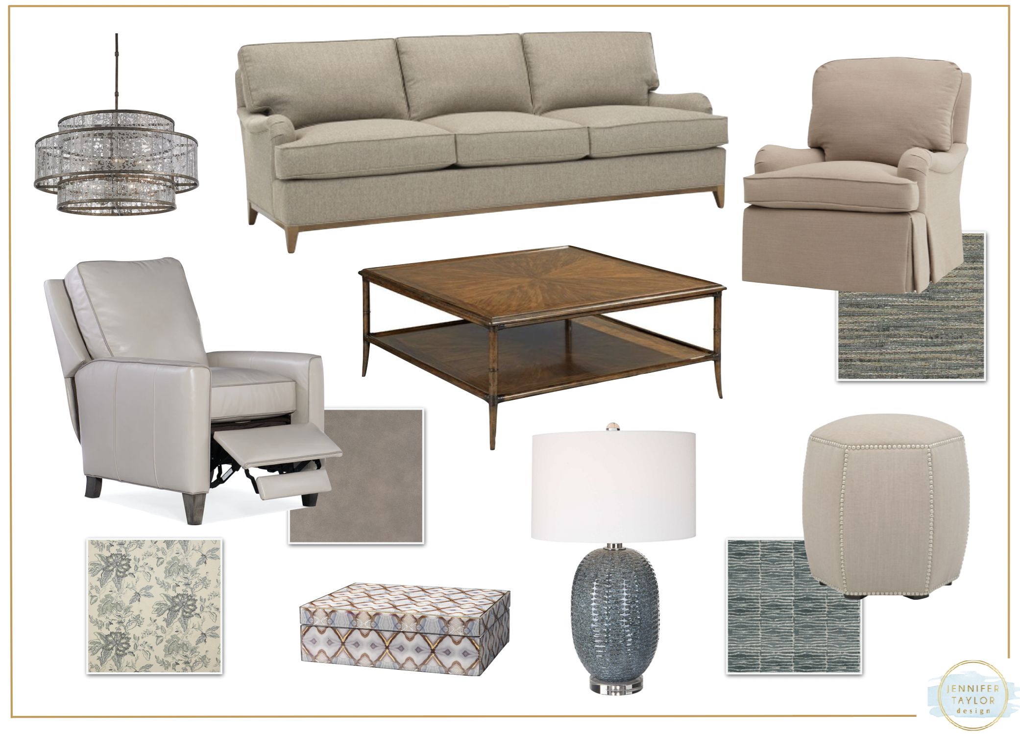The design concept started with three furniture plans so we could illustrate how having a recliner would require a larger, custom rug due to the shape of the layout. Ideally, we would have put an accent chair near the fireplace, but having a recliner was important to the client so we made it work.