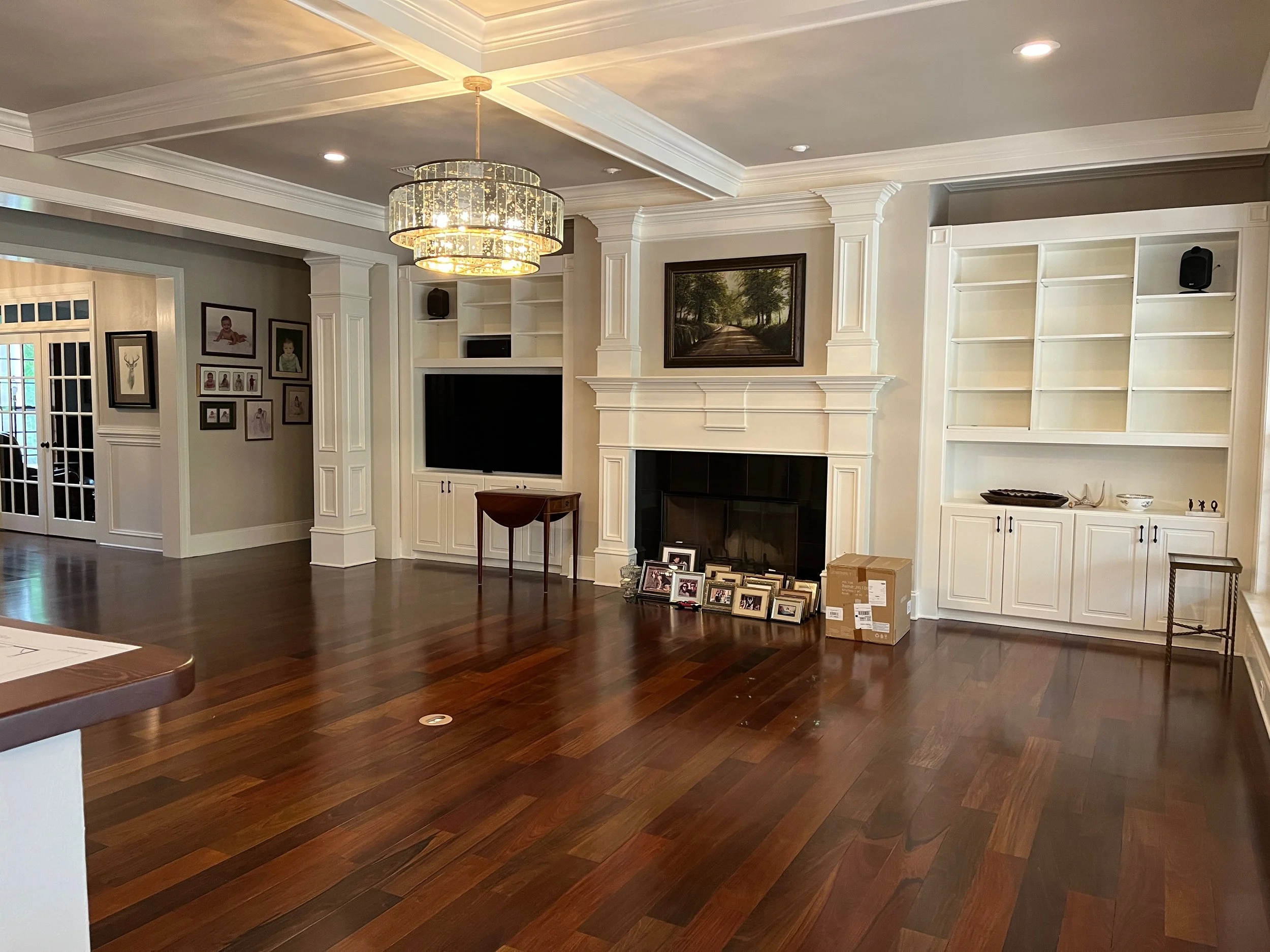 The renovation took longer than planned, as most do. So we had to store the furniture for a few extra months since we didn’t want to install until the space was completely done. Thankfully, I have a receiving warehouse that kept everything safe until we were ready. Everything went in, as planned and our clients were thrilled with the results. We came back a second time to fine tune the accessories. Here is what it looked like on install day.