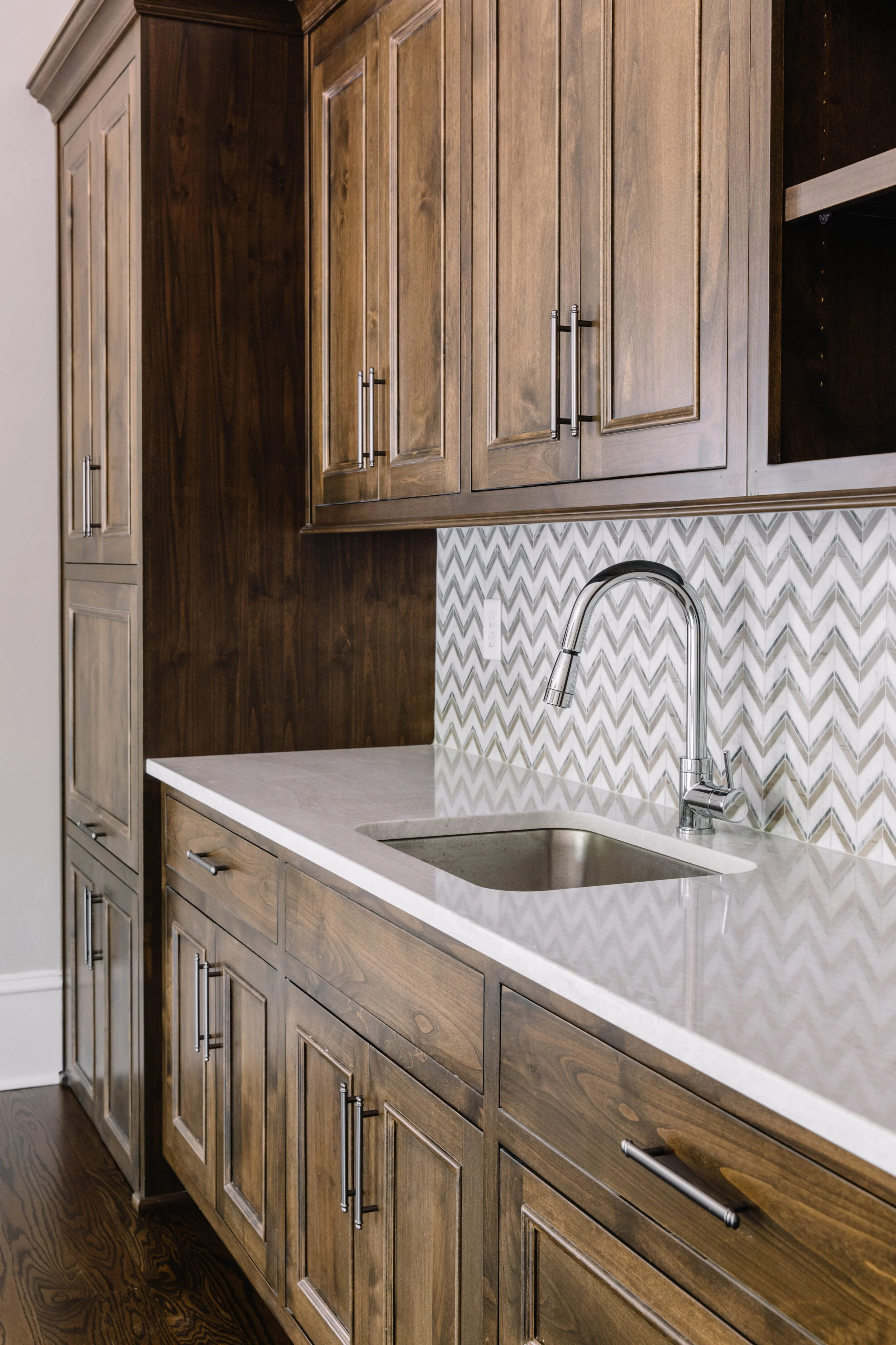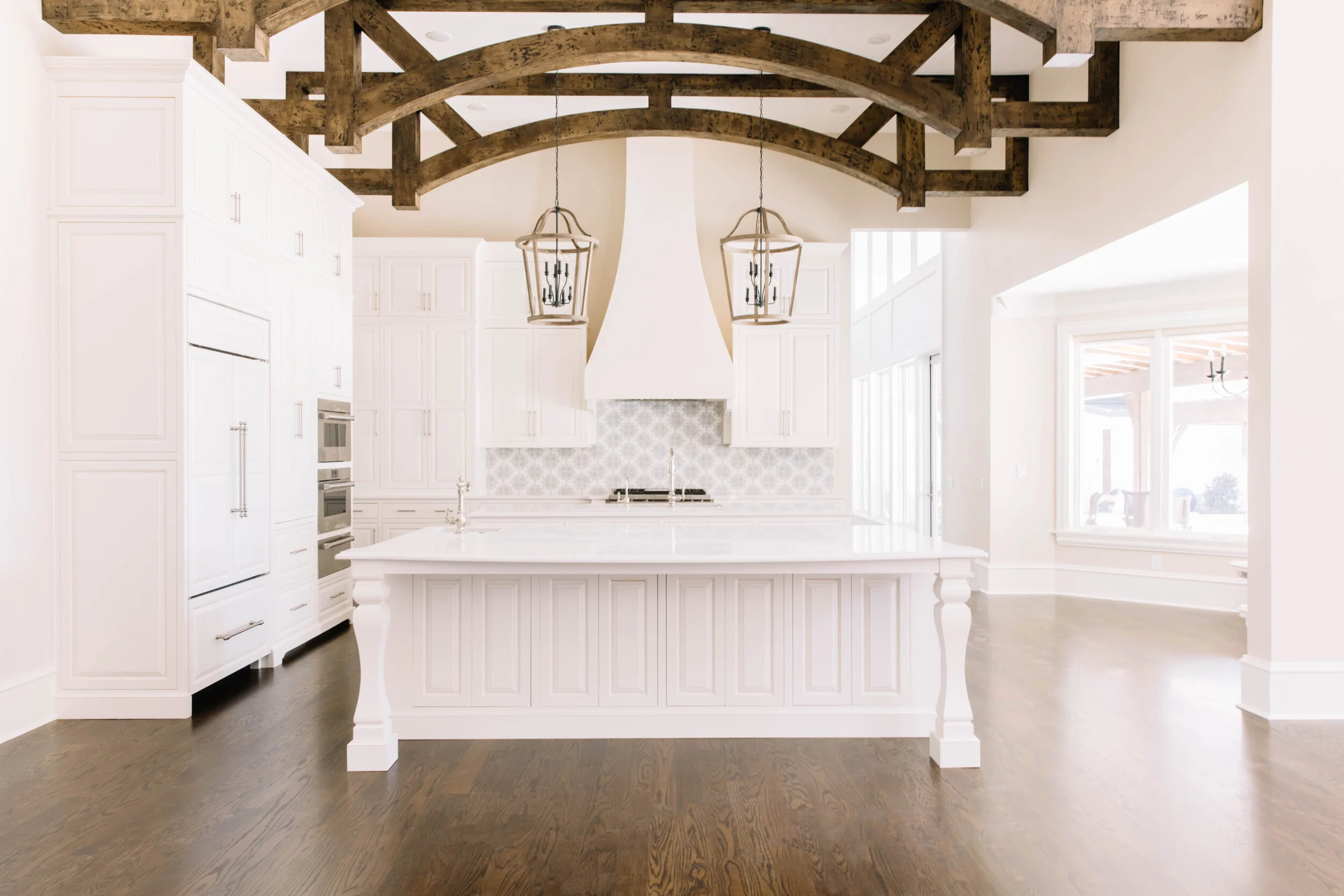 The kitchen was the most dramatic makeover. We kept the double island layout and with a few changes to the perimeter layout - the kitchen functions (and looks) so much better. My client wanted a “European Farmhouse” feel and when she found an inspiration photo with similar beams, we designed a kitchen like no other.