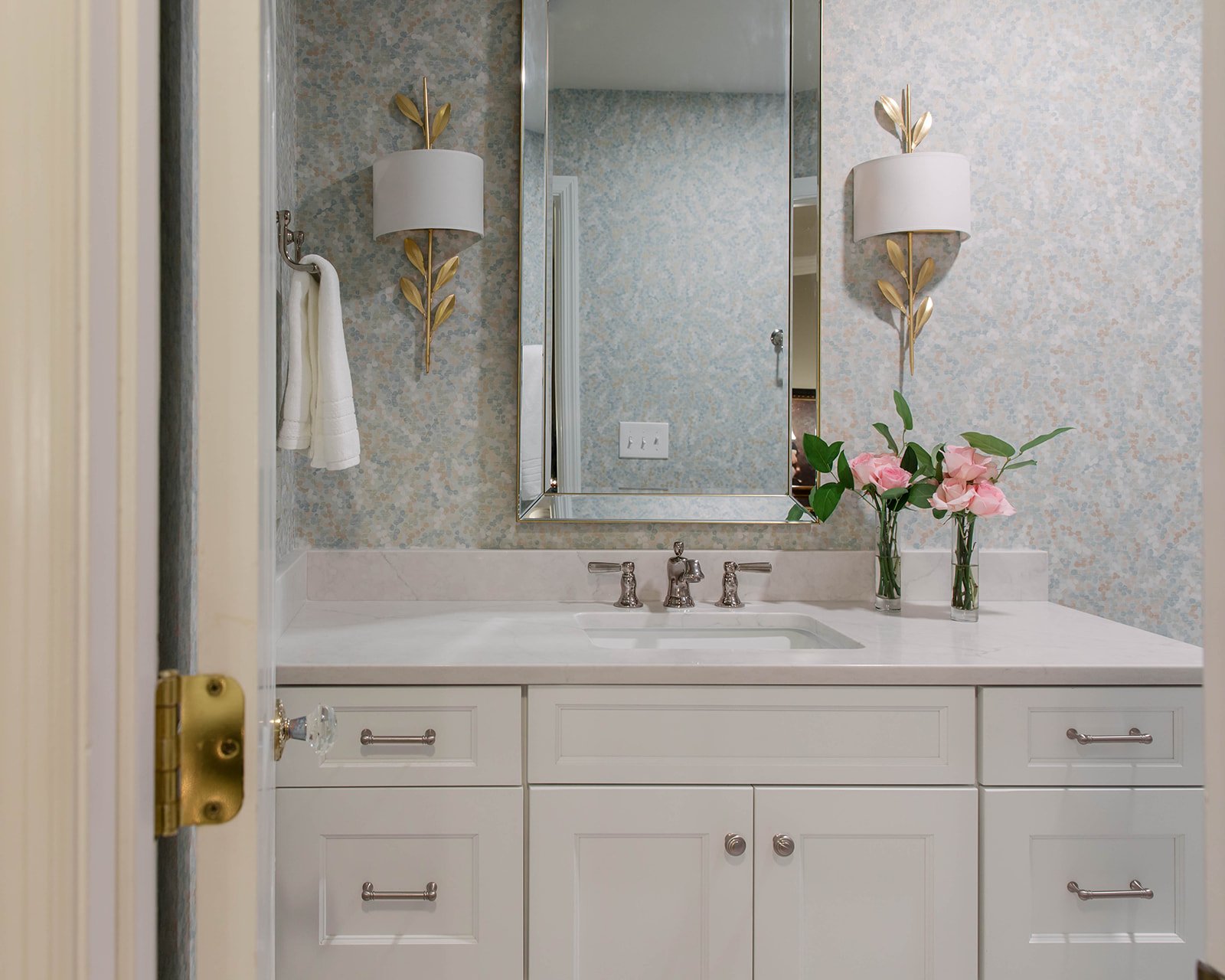 We opted to eliminate the second sink, giving more counter space and the opportunity to incorporate a decorative mirror with wall sconces on either side. This small change created a more functional and visually stunning design. And since wallpaper was on our client’s wish list, we selected a gorgeous pattern that adds just the right touch of personality.
