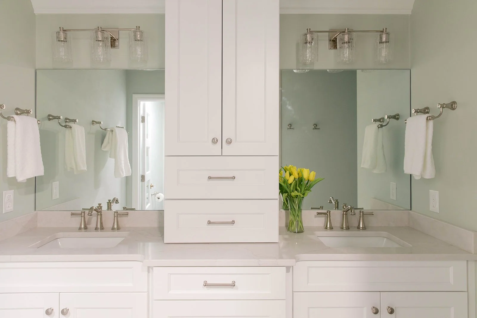 Now, let’s move on to the bathrooms. Upstairs, there were two full bathrooms in desperate need of an update. As empty nesters, our clients wanted these spaces to be functional for their adult children and grandchildren during visits. The larger of the two bathrooms was originally the master bath. In a previous renovation, the garden tub and shower had been removed in favor of a walk-in shower, using one of those “quick fix” acrylic units. Unfortunately, the result didn’t meet their expectations. They were ready to have a tub back.