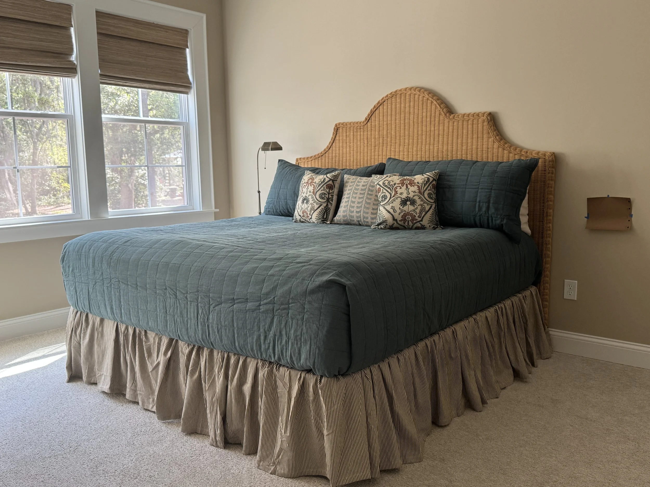 In our upstairs guest bedroom, the goals were to get the windows covered, the bed set up, styled and the shower curtain done in the bathroom. I was able to accomplish all that and a little more.