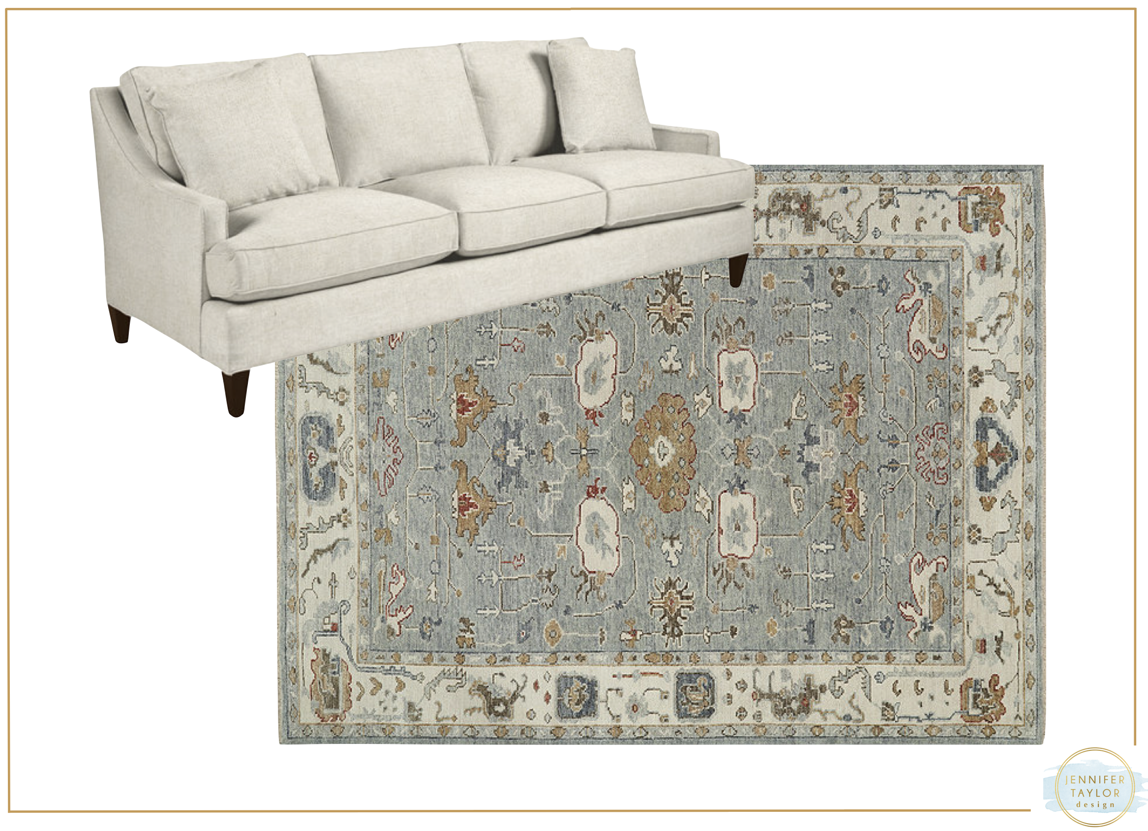 After I have preliminary furniture layout, I begin selecting the pretty pieces. I like to start with a rug or fabric for color inspiration and then begin selecting the large upholstery pieces (sofa and chairs). For this space, I’m keeping it classic and mostly traditional with some soft color mixed in.