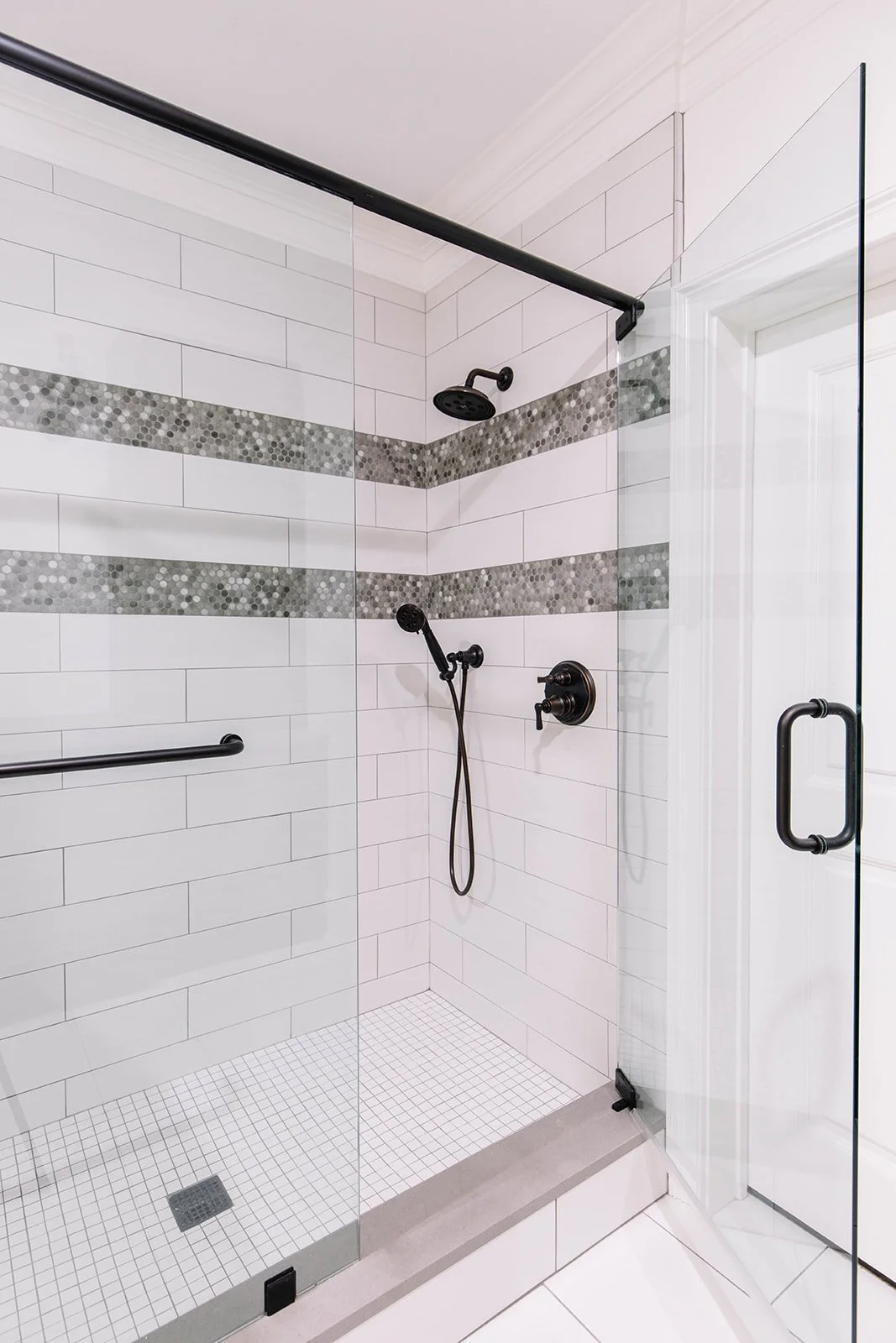 Most bathrooms need a lot of tile, so this is another place you can keep costs down. One trick I like to use for my clients is keeping the tile selection budget friendly and just install it in an interesting way. In this bathroom, the penny round tile was the most expensive. So, we only used it as an accent on the shower walls. Everywhere else we used the same simple tile but in different shapes - elongated subway on the walls, square mosaic on the shower floors and large rectangle tile on the main floor.