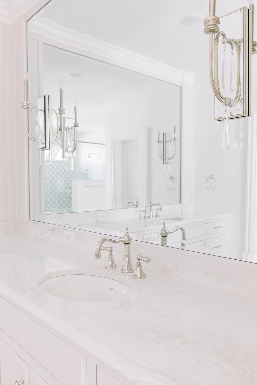 Quartz countertops are man-made, but with natural quartz. Less than 10% of the materials used are not natural such as colorants and resins. The quartz dust is mixed with these other materials and pressed into slabs. It’s much more durable than granite (or other natural stones) and because it’s non-porous, you don’t have to seal it. Check out Cambria for more details on quartz. I specify Cambria brand quartz more than any other brand and that is what I used in the bathroom pictured below. One is because their pricing structure is easy (just 2 or 3 levels) and they are made in the USA. I also like a brand called Vadara, which is made in South Korea. They actually have the best marble “look a likes” I’ve seen on the market. The veining is very natural looking to me. I used Vadara in the kitchen pictured below.