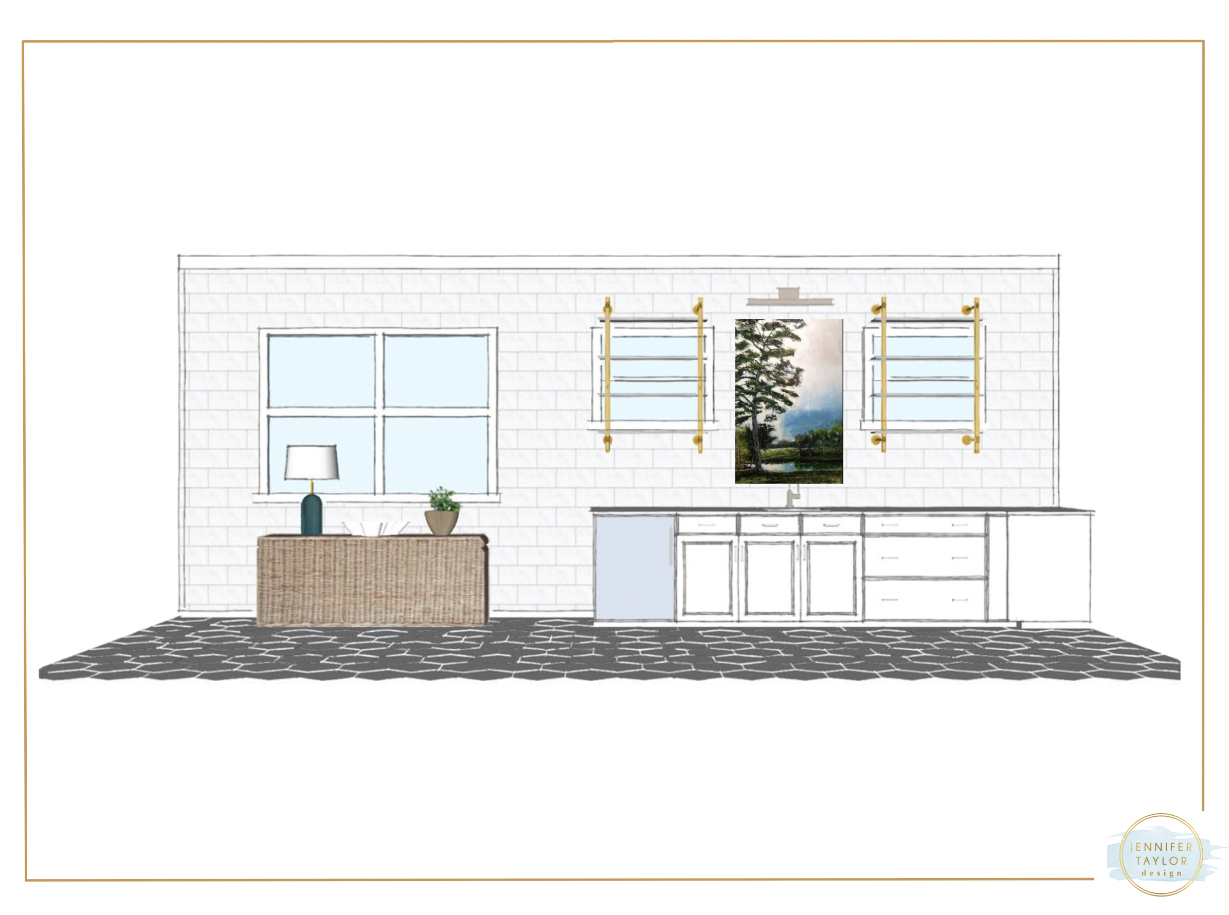 Here are some of our inspiration plans and ideas for the kitchen. I wanted to give the window wall some much needed personality by installing the tile on the entire thing. My client is having a painting done of her favorite backyard trees, so it has a place of honor with a picture light. In our first presentation, the rendering features some amazing glass shelves in front of each window, but it was “a little too edgy” for one of my clients (his name starts with B) so that was cut early on. He’s also not sold on tiling the entire wall, but I’m still working on him!