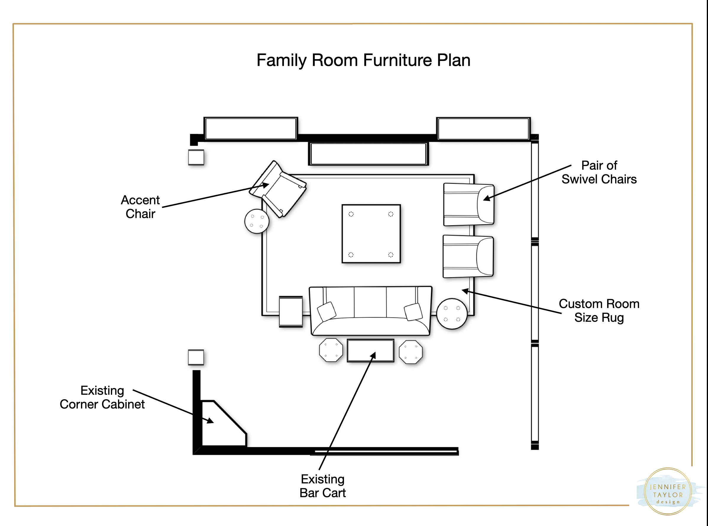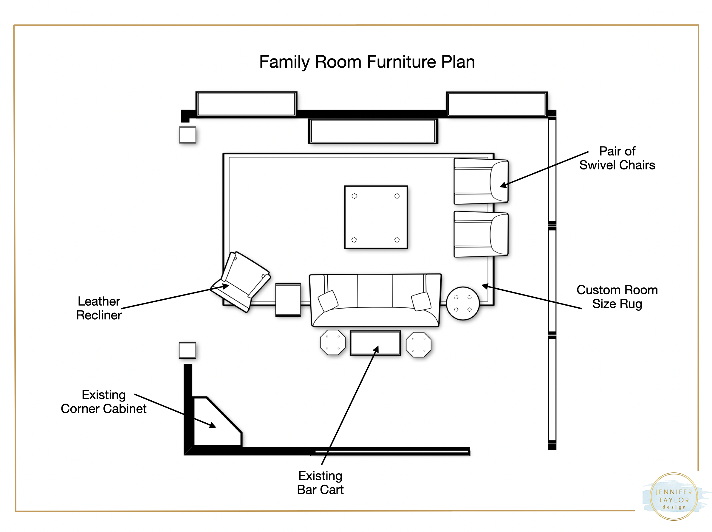 Every good room starts with a furniture plan. We are incorporating a few existing pieces, but most everything is new. The top plan is what we first presented, but my client (his name starts with a B) really wanted a recliner. So we adjusted. It’s all about the compromise sometimes!