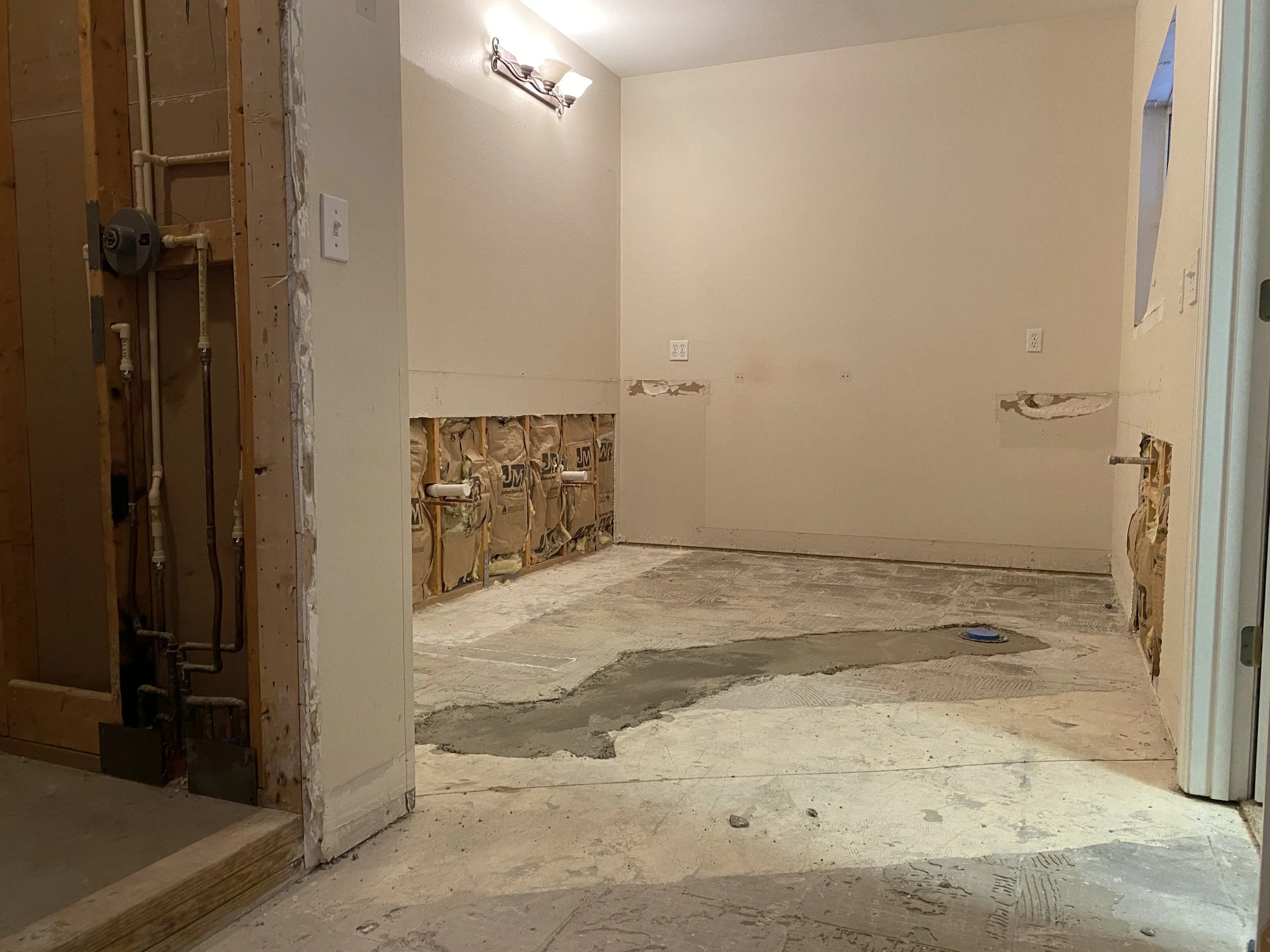 My demo phase consisted of coordinating four different trades. First, I had a contractor come in to remove and dispose of the pony wall, mirror and shower door. Then, my cabinetmaker removed all of my existing cabinets. Tile demo was next, which was super messy! And even though it wasn’t technically “demo”, this is when I needed to bring in the plumber to make the plumbing changes - we moved the sink valves, made some minor changes to the shower valves and added all the plumbing for the new freestanding tub.
