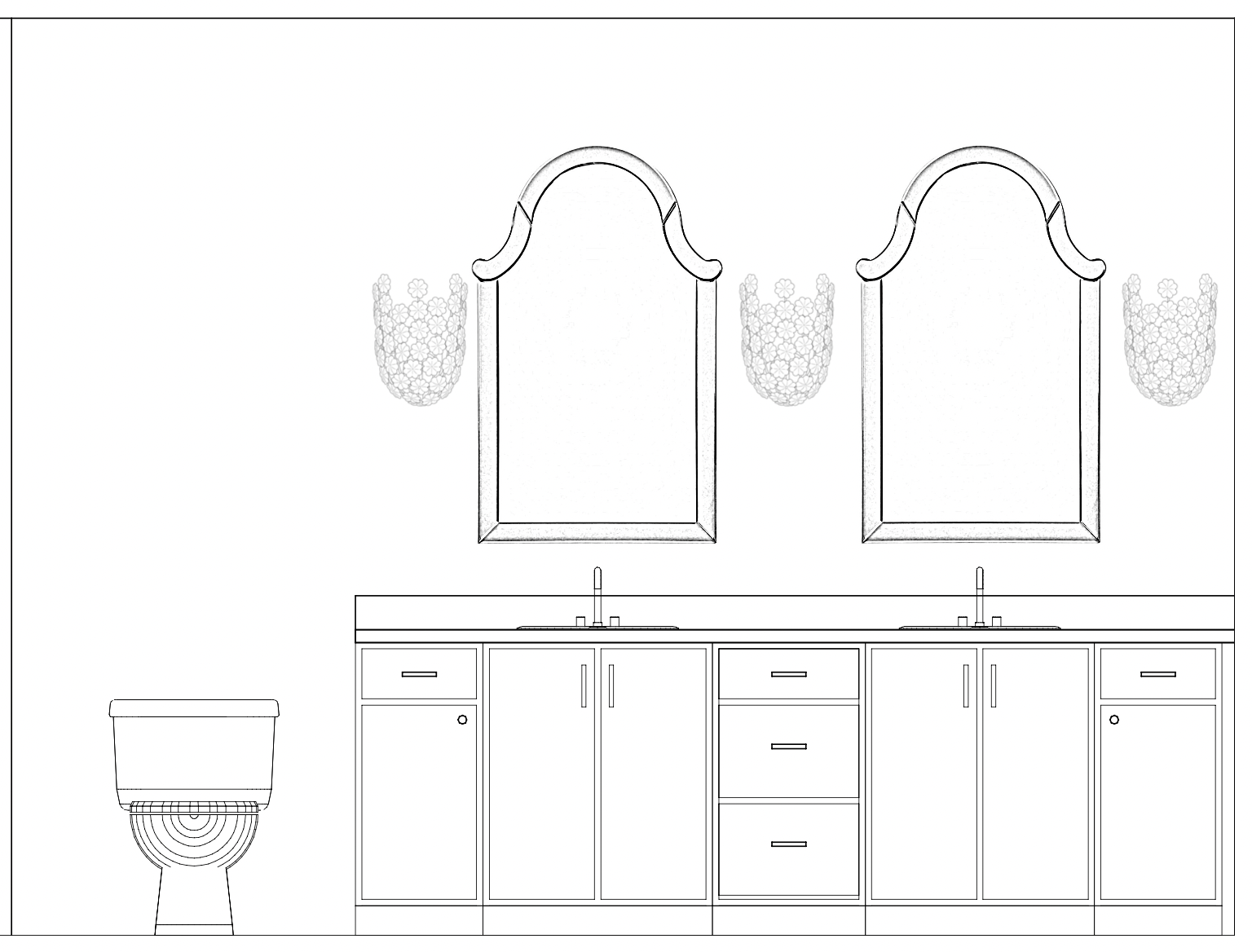 Finally, here’s a peak at how my vanity space will look. I’ve decided to go with decorative mirrors with wall sconces. I’m doing a few unique things in my cabinets. Instead of a false drawer front under each sink, I’ve asked for full-height doors. This is where I’ll store my towels, extra toilet paper and other larger things. Inside the cabinets on each end, I’m having two pull-out shelves installed so I have an easy place to store my hair dryer and make-up. The small top drawers are the perfect spot for my toothbrush!