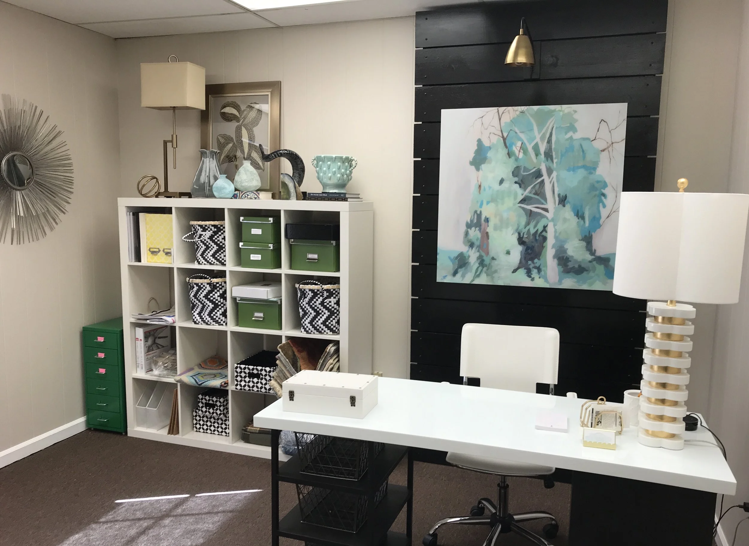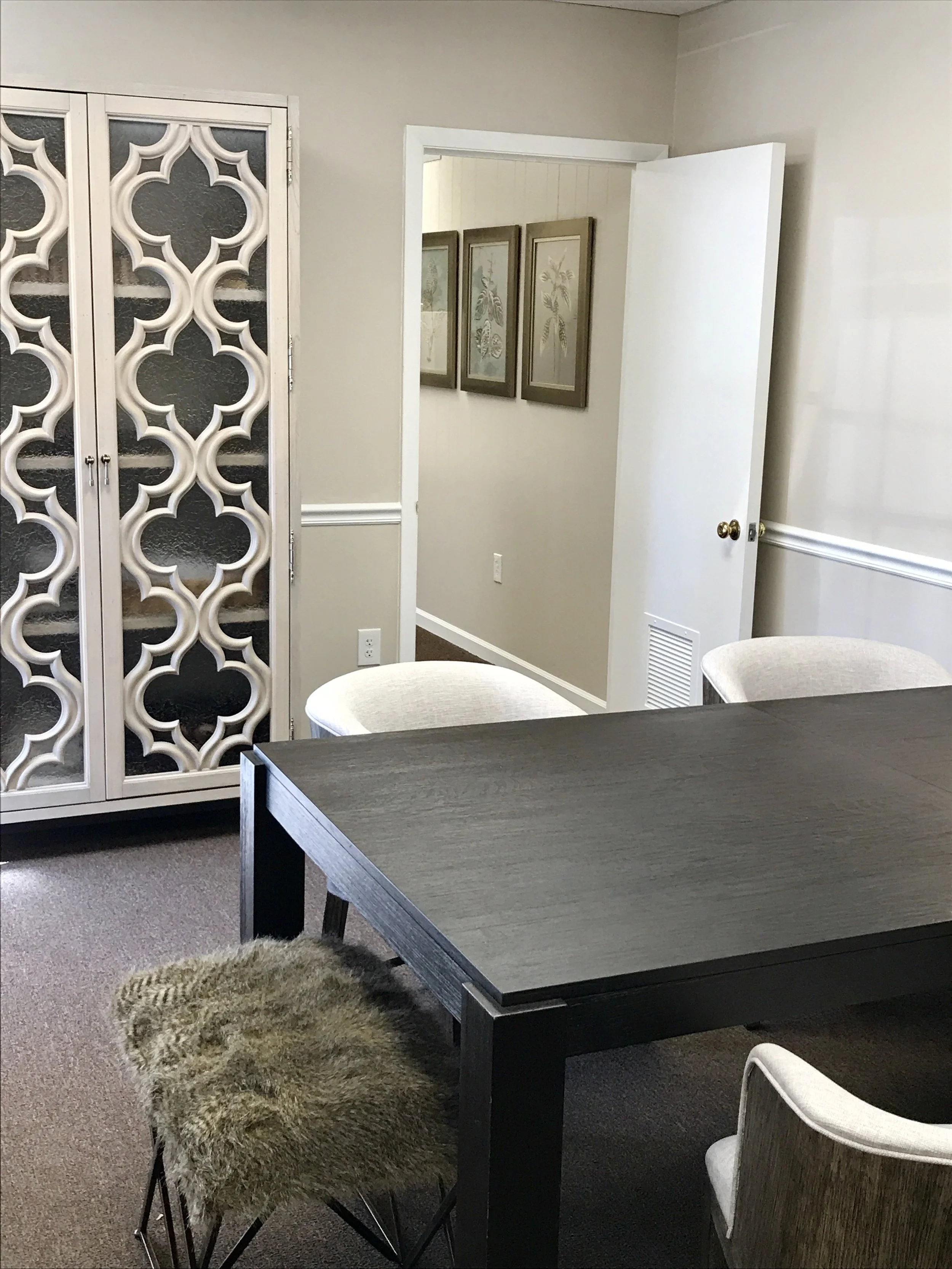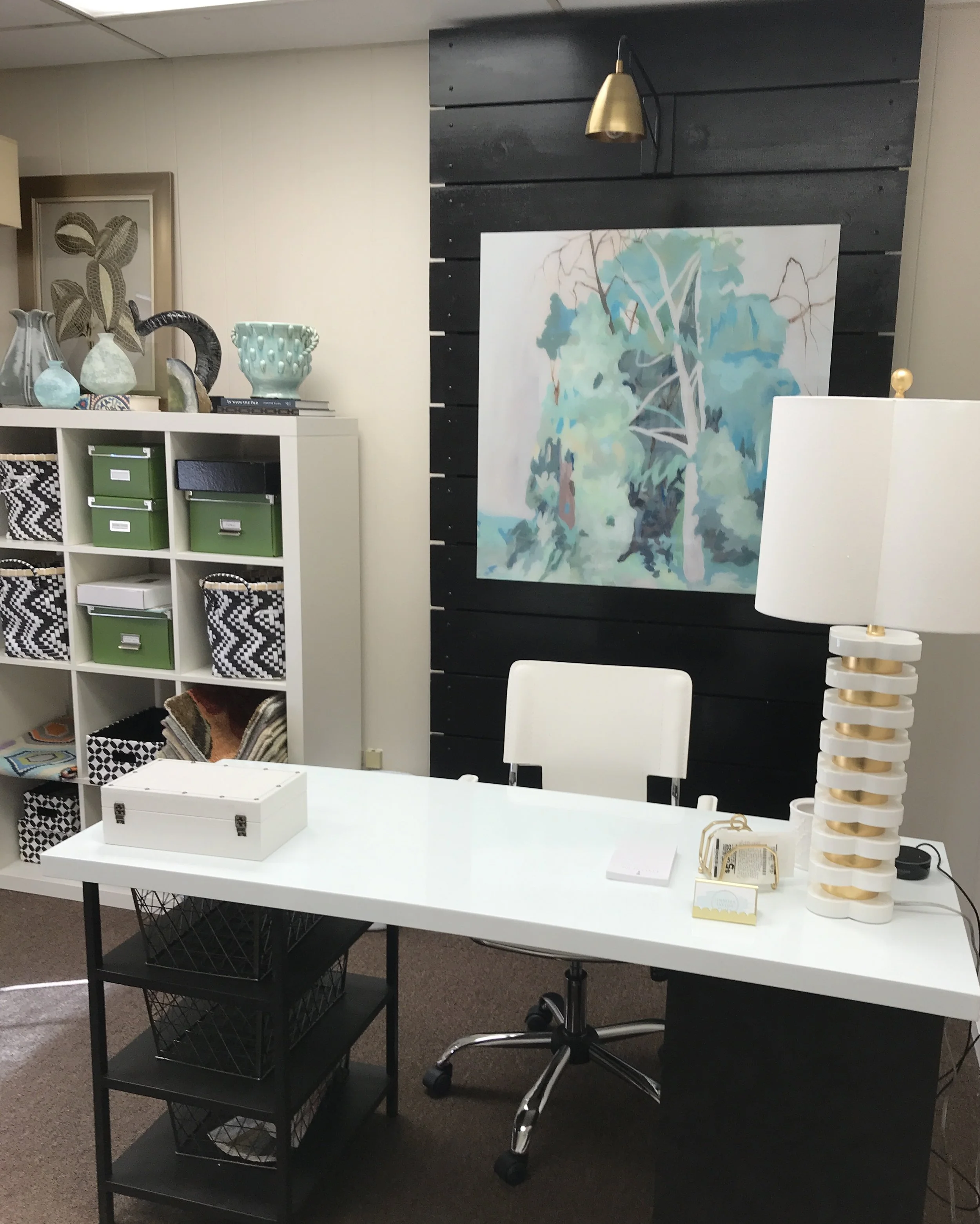 As you can see, I had to really look past all the negatives and know I could create a space I could be proud of. Now, a year later I'm finally sharing my new space. The main room is where I meet clients and store a lot of my samples. I still have a wish list of more improvements (draperies, new fabric on the chairs, etc) but those will come with time. The more I can disguise that ugly brown carpet, the better!