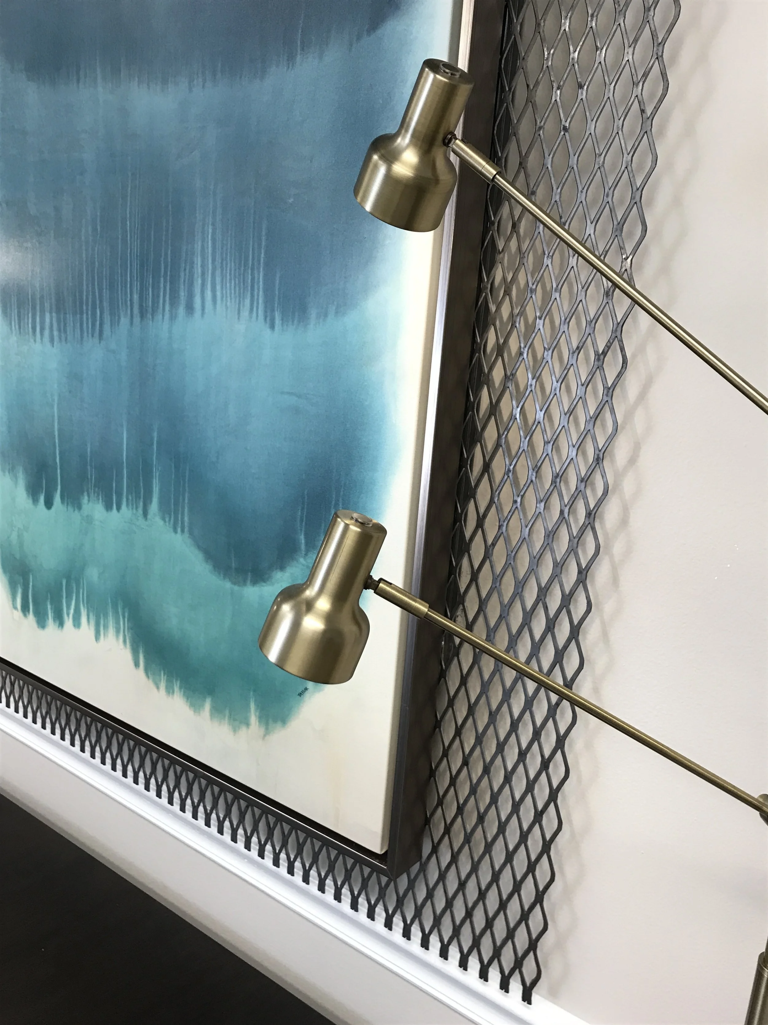 One of my favorite things in my office is the wall space above the meeting table. I had a metal screen fabricated by my local metalworker and installed some colorful art on top, then added some fun floor lamps on each side. It was a great mix of contemporary and industrial!