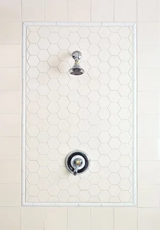 Or just by changing the direction of the white subway tile, you create a little more interest in the shower. I also love the hexagon shape they used on this shower floor.