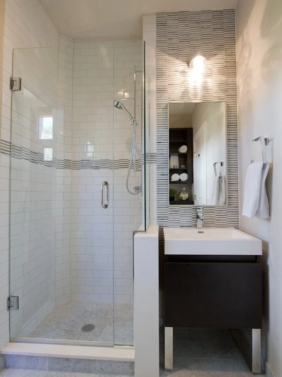 Finally, in this small shower the accent tile has more presence because it's tied into the vanity area. Another great example of simple subway tiles turned up a notch!