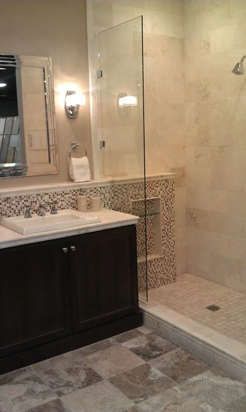 I'm excited to be doing this post as I hope I could find some great ideas for my clients, while researching for this. I design a lot of showers and one of my biggest struggles is what can we do to really give this space a unique look, without it looking dated in a few years or breaking the bank. I also like to do something a little different for each client and that creates even more angst in coming up with something creative. All of these images were found on Pinterest and are the work of other designers.