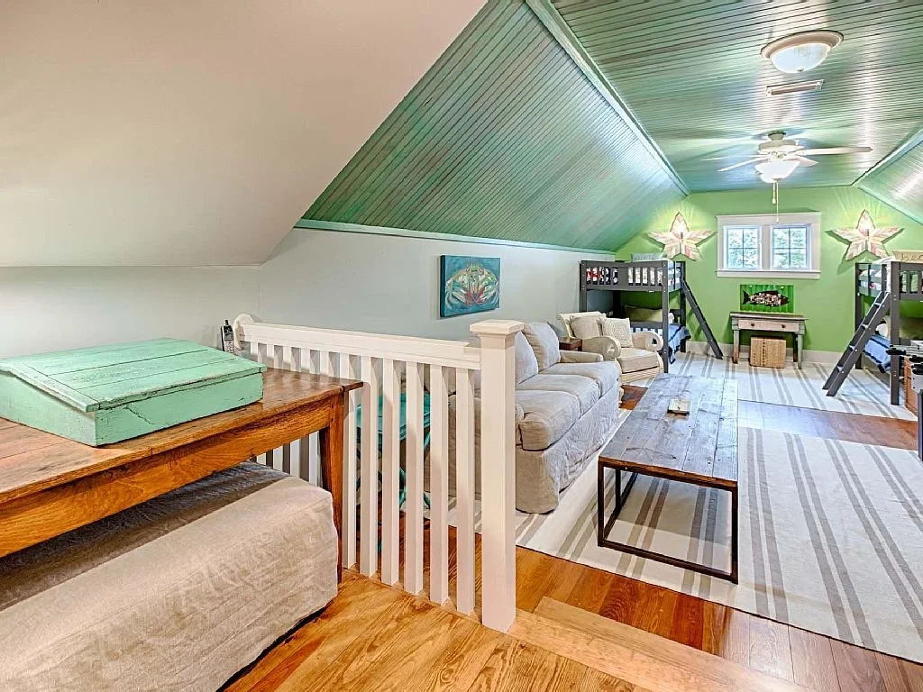 The upstairs was totally planned with the kids in mind! In addition to the two bedrooms and bath, there is a large playroom at the top of the stairs. We were able to really improve its function by replacing the twin beds with new bunks and moving the furniture and art around. Again, simple changes with big impact.