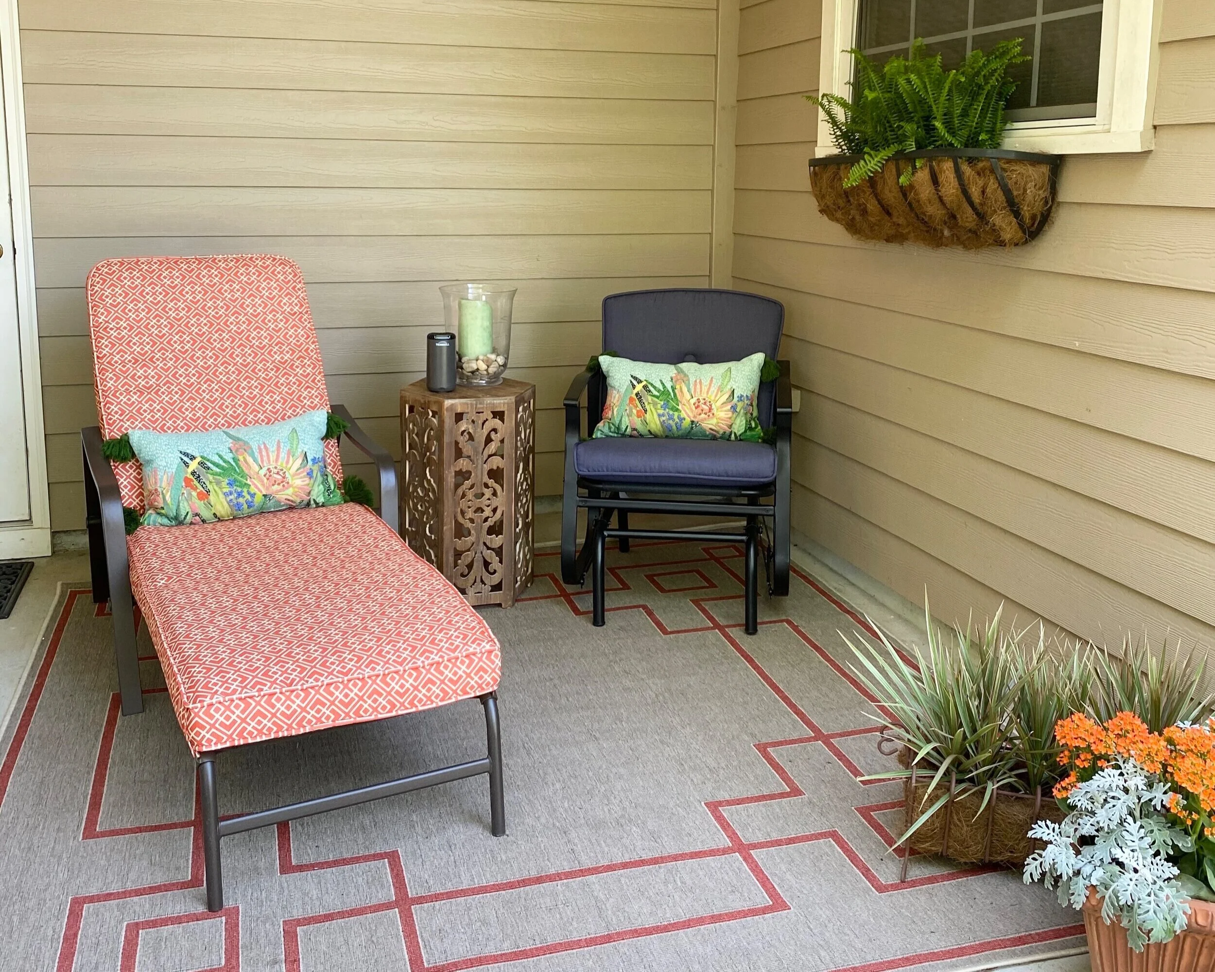 I found a chaise lounge and glider chair in two of my favorite colors (War Eagle) and got those ordered right away. Walmart got them to me very quickly and they were very easy to put together. I added a great outdoor rug from one of my vendors to cover up all that ugly concrete. You can literally hose it off when you need to clean it. Then, I finished off the space with some live plants and accessories. I’ve so enjoyed using this little patio over the last few weeks!